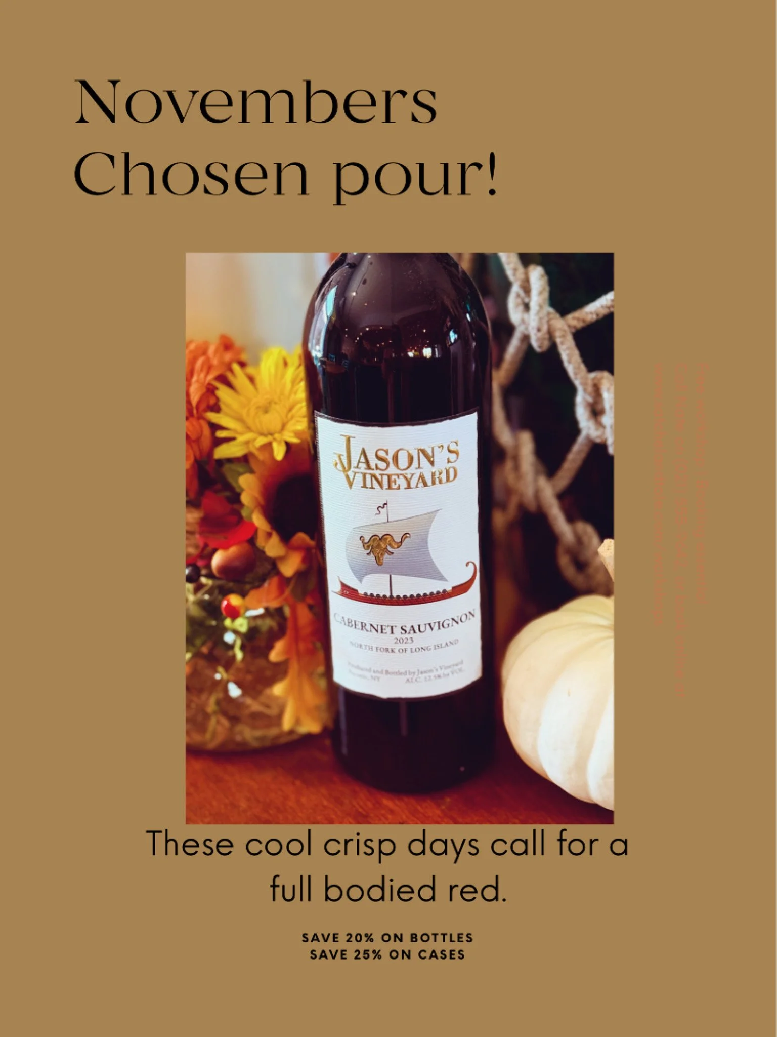 Novembers Chosen Pour Saturday, November 1, 2025 11:00 AM 11:00 Sunday, November 30, 2025 6:00 PM 18:00 Jason's Vineyard 1785 Main Rd Jamesport, NY, 11947 United States (map) Google Calendar ICS Novembers “Chosen pour” is Cabernet Sauvignon 2023