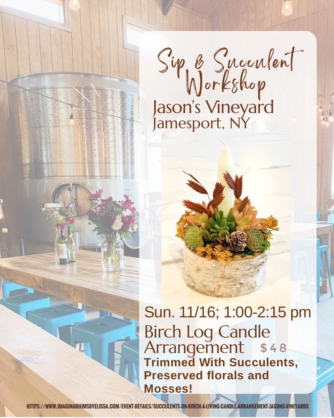 Join us for a relaxing afternoon and create a long lasting succulent centerpiece with Imaginariums by Elissa https://www.imaginariumsbyelissa.com/event-details/succulents-on-birch-a-living-candle-arrangement-jasons-vineyards